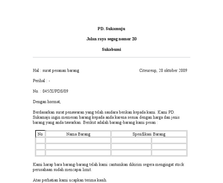 Documents similar to surat permohonan pengadaan barang.doc. Biaya pembelian batu bata 2000 pcs : Dan yang terpenting isinya harus menjelaskan barang yang kita beli, seperti kode barang (nama barang). Pembantu rektor ii universitas madura pamekasan di tempat. Apa itu surat penawaran barang?